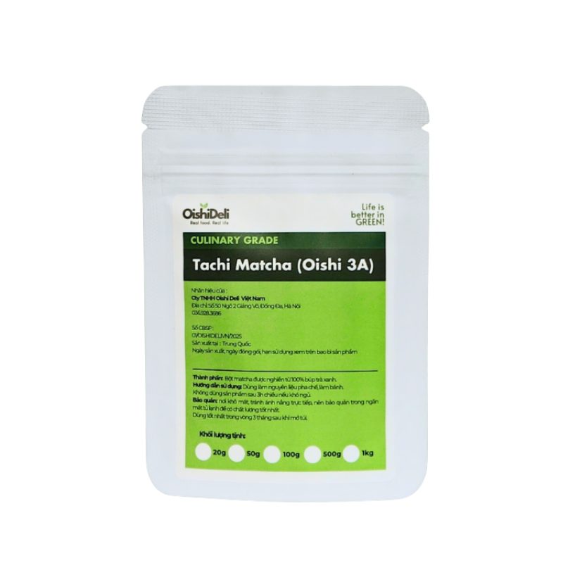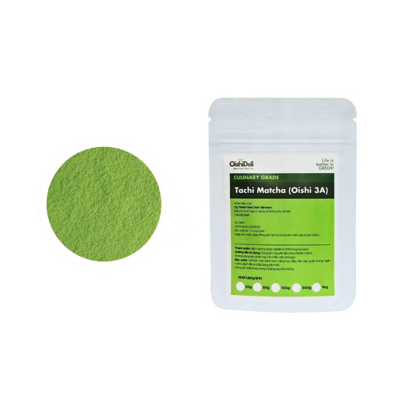 Bột Matcha Tachi 100g (thường được biết đến với tên gọi Oishi 3A) là dòng bột trà xanh phổ thông được ưa chuộng rộng rãi nhờ sự cân bằng giữa hương vị và chi phí. Đây là “nguyên liệu vàng” cho các mô hình trà sữa, cà phê và tiệm bánh nhờ khả năng tạo màu xanh tươi mới và mùi thơm trà xanh dễ chịu, phù hợp với khẩu vị đa số người tiêu dùng Việt Nam.