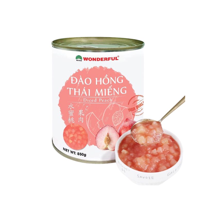 * Tiết kiệm thời gian & chi phí: Chủ quán không còn lo lắng về việc chế biến hay bảo quản đào tươi khó khăn. Với thiết kế lon thiếc 850g tiện lợi, bạn dễ dàng lưu trữ và sử dụng ngay, giúp tối ưu chi phí vận hành cho quán.
